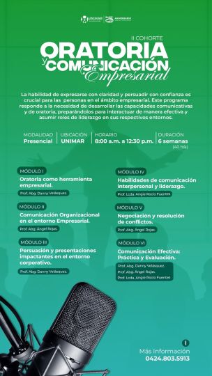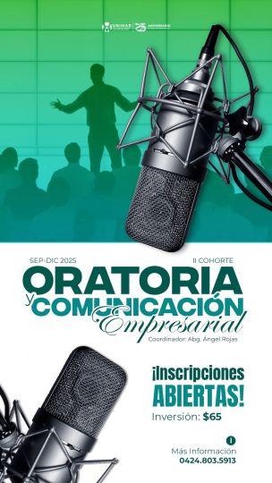 La Universidad de Margarita les invita a participar en el programa formativo “Oratoria y Comunicación Empresarial”, una experiencia diseñada para fortalecer sus competencias comunicativas con impacto y proyección profesional.