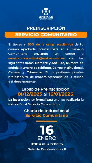 El Departamento de Servicio Comunitario, convoca a los estudiantes que tienen el 50% de la carga académica de la carrera que cursan aprobada, a preinscribirse para ejecutar el Servicio Comunitario.